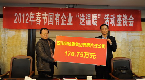1月13日上午,省國資委黨委副書記雷建、企業(yè)領(lǐng)導(dǎo)人員管理處處長舒勇、宣傳工作處處長鐘德盛、黨建工作處處長楊會思一行到川投集團(tuán)召開2012年春節(jié)國有企業(yè)“送溫暖”活動座談會。集團(tuán)公司在家的領(lǐng)導(dǎo)班子全體成員,峨鐵集團(tuán)黨委書記、總經(jīng)理、嘉陽集團(tuán)工會主席,以及集團(tuán)本部退休員工代表、嘉陽集團(tuán)、峨鐵集團(tuán)、巴蜀公司離退休、困難職工代表參加了座談會。