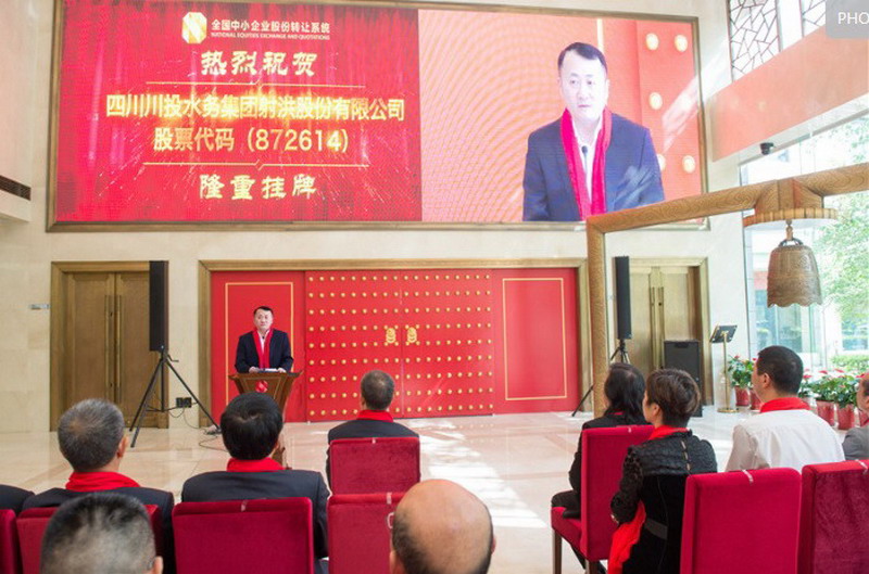 2018年5月8日,川投集團旗下的四川川投水務集團射洪股份有限公司在北京市全國中小企業(yè)股份轉(zhuǎn)讓系統(tǒng)公司舉行正式掛牌儀式。省國資委黨委委員、副主任宣迅,川投集團董事、副總經(jīng)理李洪,射洪縣委書記蒲從雙,川投水務集團董事長梁有國、總經(jīng)理鄧銳以及省國資委產(chǎn)權監(jiān)管處、企業(yè)改革處、辦公室,射洪縣委、縣政府相關負責人等參加了掛牌敲鐘儀式。省國資委副主任宣迅、射洪縣委書記蒲從雙分別致辭,對川投水務射洪公司成功掛牌新三板表示祝賀,希望繼續(xù)做好民生服務和保障工作,進一步深化改革,加快國企優(yōu)質(zhì)資源整合,壯大國有資本上市規(guī)模。川投集團董事長代表川投水務射洪公司敲響了開市寶鐘。