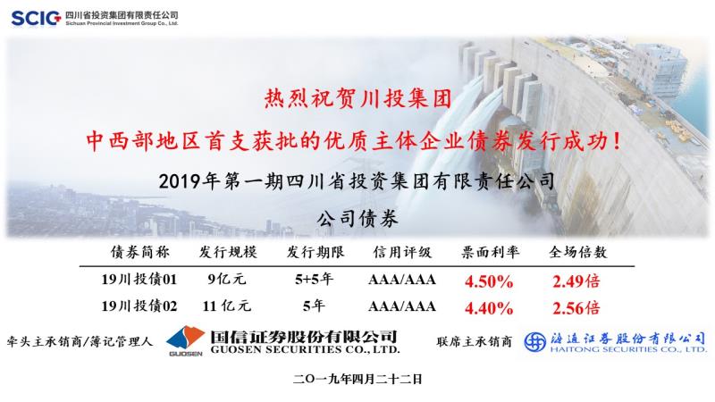 2019年4月22日,四川省投資集團(tuán)有限責(zé)任公司成功發(fā)行中西部地區(qū)首支獲批的優(yōu)質(zhì)主體企業(yè)債券。本期發(fā)行規(guī)模20億元,其中品種一“19川投債01”發(fā)行規(guī)模9億元,期限10年,票面利率4.50%;品種二“19川投債02”發(fā)行規(guī)模11億元,期限5年,票面利率4.40%。本期債券的成功發(fā)行,標(biāo)志著川投集團(tuán)依托資本市場向創(chuàng)新融資方式、促進(jìn)產(chǎn)業(yè)升級(jí)、服務(wù)四川經(jīng)濟(jì)又邁出重要一步。