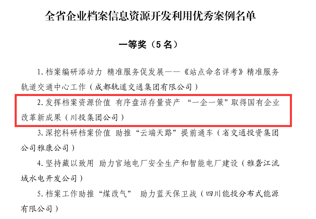 日前,四川省檔案局下發(fā)《關(guān)于表?yè)P(yáng)全省企業(yè)檔案信息資源開(kāi)發(fā)利用優(yōu)秀案例的通知》(川檔發(fā)〔2019〕10號(hào)),對(duì)全省企業(yè)檔案信息資源開(kāi)發(fā)利用通報(bào)表彰,經(jīng)過(guò)企業(yè)申報(bào)、部門審核、專家評(píng)審和省檔案局研究,川投集團(tuán)檔案工作榮獲一等獎(jiǎng)。
