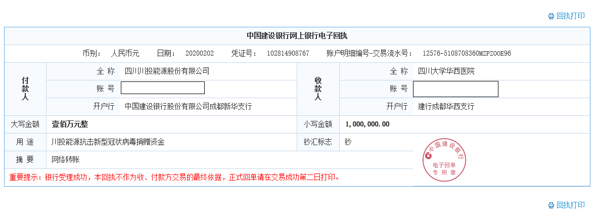 2月2日,由川投集團(tuán)控股的川投能源向我省一線醫(yī)療救助機(jī)構(gòu)——四川大學(xué)華西醫(yī)院捐贈現(xiàn)金一百萬元,專項用于本次新型冠狀病毒肺炎疫情防控工作,以實際行動彰顯國有控股上市公司的社會責(zé)任和企業(yè)公民義務(wù)。