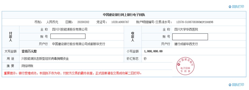 先期捐贈100萬元馳援抗疫一線。當(dāng)前,各醫(yī)療機(jī)構(gòu)尤其是一線救治場所防護(hù)物資嚴(yán)重短缺,疫情防控形勢嚴(yán)峻。川投集團(tuán)組織動員旗下上市公司川投能源積極發(fā)揮上市公司示范引領(lǐng)作用,積極投身疫情防控工作,對疫情較為集中的一線醫(yī)療機(jī)構(gòu)進(jìn)行捐贈支援,最大限度提供國有企業(yè)保障支持。2月2日,川投能源向我省一線醫(yī)療救助機(jī)構(gòu)——四川大學(xué)華西醫(yī)院捐贈現(xiàn)金一百萬元,專項(xiàng)用于本次新型冠狀病毒肺炎疫情防控工作,及時滿足救治患者的物資購置所需。川投能源本次100萬元定向捐款,以實(shí)際行動助力打贏疫情防控阻擊戰(zhàn),彰顯國有控股上市公司的社會責(zé)任和企業(yè)公民義務(wù)。