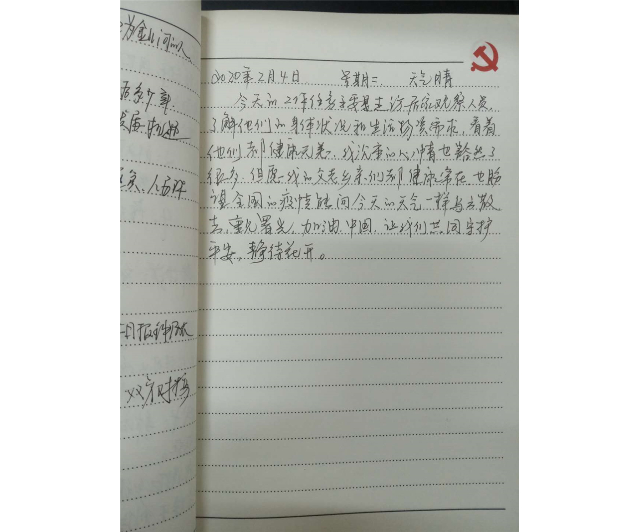 2月4日,天氣晴,今天的工作任務(wù)主要是走訪居家觀察人員,了解他們的身體狀況和生活物資需求,看著他們都健康無恙,我沉重的心情也豁然了很多。祝愿我的父老鄉(xiāng)親們都健康常在,也盼望全國的疫情能向今天的天氣這樣烏云散去,重見曙光。加油中國!