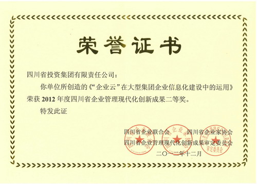 4月22日,2013年四川省企業(yè)管理創(chuàng)新大會(huì)暨四川省企業(yè)管理創(chuàng)新示范單位現(xiàn)場(chǎng)會(huì)在都江堰召開,川投集團(tuán)《“企業(yè)云”在大型集團(tuán)企業(yè)信息化建設(shè)中的運(yùn)用》獲得四川省企業(yè)管理現(xiàn)代化創(chuàng)新成果二等獎(jiǎng),并得到全國(guó)管理創(chuàng)新成果審定委員會(huì)執(zhí)行副主任胡新歡高度評(píng)價(jià)。