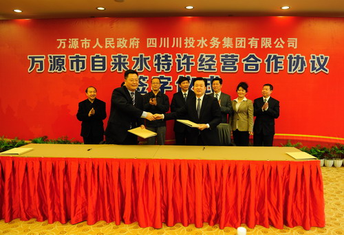 簽字儀式上,集團公司副總經理、川投水務集團董事長李文志與中共萬源市委副書記、市人民政府市長吳曉勇簽訂了《萬源市城區(qū)自來水特許經營合作協(xié)議》;川投水務集團總經理梁有國與萬源市國資辦主任陳守英簽訂了《民生供排水公司國有產權和特許經營權轉讓協(xié)議》。根據兩個協(xié)議,川投水務集團收購民生公司全部產權和萬源市城區(qū)30年自來水特許經營權,并投資建成馱山水廠,有效解決萬源市城區(qū)市民用水困難的問題。兩個協(xié)議的簽訂,標志著川投水務集團在項目拓展、壯大規(guī)模方面取得新的進展。