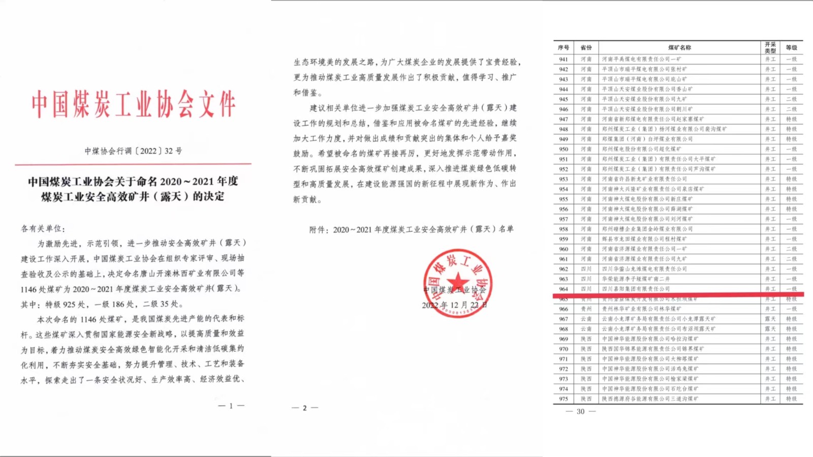 12月22日,根據(jù)《中國煤炭工業(yè)協(xié)會關(guān)于命名2020-2021年度煤炭工業(yè)安全高效礦井(露天)的決定》(中煤協(xié)會行調(diào)〔2022〕32號)文件,嘉陽集團(tuán)嘉陽煤礦從全國一千一百多家煤礦企業(yè)中脫穎而出,被命名為全國煤炭工業(yè)安全高效一級礦井(露天),蟬聯(lián)這一殊榮。