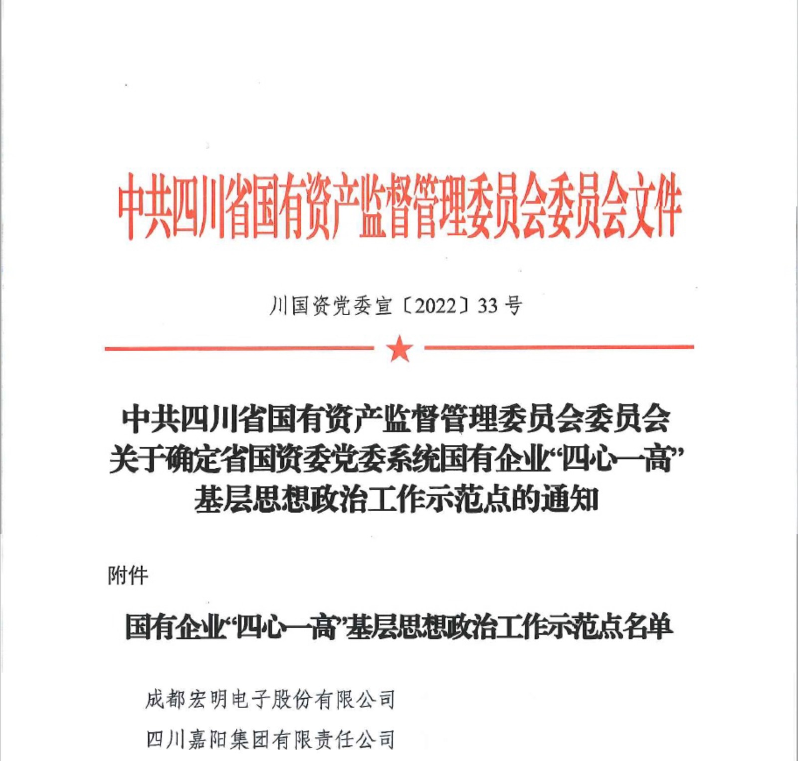 近日,中共四川省國有資產(chǎn)監(jiān)督管理委員會委員會發(fā)布《關(guān)于確定省國資委黨委系統(tǒng)國有企業(yè)“四心一高”基層思想政治工作示范點的通知》,川投集團所屬成都宏明電子股份有限公司、四川嘉陽集團有限責任公司兩家單位榜上有名,成功躋身示范點。