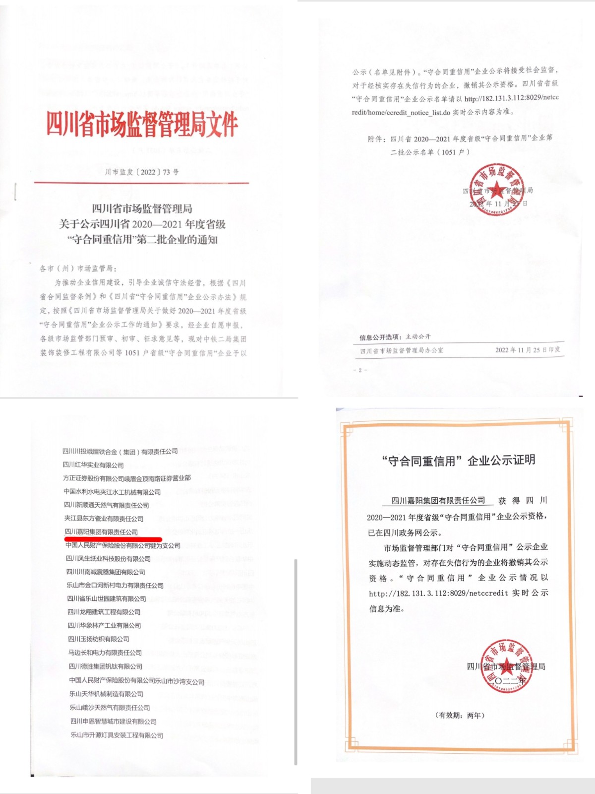 獲得該稱號的還有川投集團所屬的嘉陽集團。作為有著85年悠久歷史的國有企業(yè),嘉陽集團始終致力于建設公平公正的商業(yè)環(huán)境,打造友好廉潔的商業(yè)交往關系,堅持把誠信作為立身之本、發(fā)展之基,在商業(yè)往來中以誠相待、重信守諾。