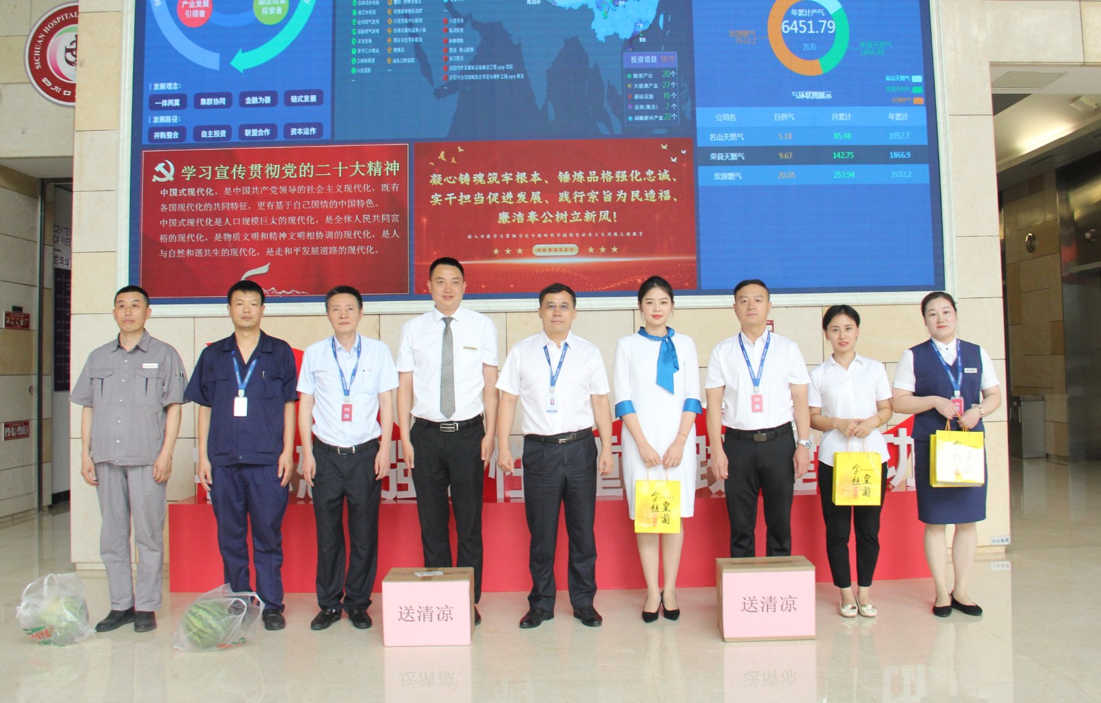 王懷林首先來(lái)到川投大廈一樓大廳門崗,對(duì)大廈基層一線物業(yè)服務(wù)人員進(jìn)行“送清涼”慰問(wèn),向堅(jiān)守在高溫下的一線員工表示親切的問(wèn)候,并送上防暑降藥品及水果。他關(guān)切的提到,高溫酷暑天氣,基層一線職工一定要注重身體狀況和防暑,做好自身防暑工作。他要求,佳友物業(yè)要合理安排高溫崗位的戶外工作時(shí)間,務(wù)必要做好員工崗位防暑物資和必要的工作環(huán)境保障。