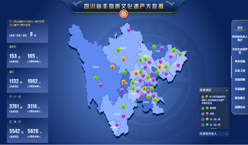 “四川省非物質文化遺產大數據”平臺以數字化方式記錄、保存和展示四川非遺資源,從前端界面、后端管理系統(tǒng)、數據庫遷移上云等方面進行了全方位設計,以可視化方式集中展示了四川非遺的圖文影音資源、地域分布、多維度統(tǒng)計數據。該平臺涵蓋代表性項目、代表性傳承人、傳承設施等基礎數據,此外,還囊括了記錄工程、文化生態(tài)保護區(qū)、非遺詞典、非遺旅游、展覽展示、輿情管理等重要非遺保護工作成果,為非遺保護工作者提供專業(yè)的信息和服務,為廣大觀眾更好地了解非遺提供了窗口。