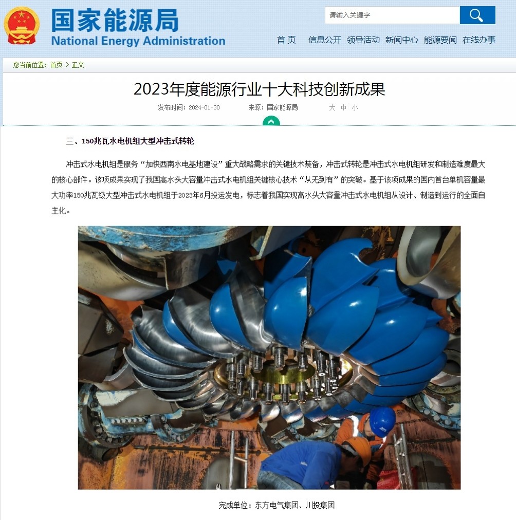 近日,國家能源局發(fā)布了2023年度能源行業(yè)十大科技創(chuàng)新成果,田灣河公司與東方電氣集團東方電機有限公司聯(lián)合研制的150兆瓦水電機組大型沖擊式轉(zhuǎn)輪成果位列其中。該項成果實現(xiàn)了我國高水頭大容量沖擊式水電機組關(guān)鍵核心技術(shù)“從無到有”的突破,標(biāo)志著我國實現(xiàn)高水頭大容量沖擊式水電機組從設(shè)計、制造到運行的全面自主化。
