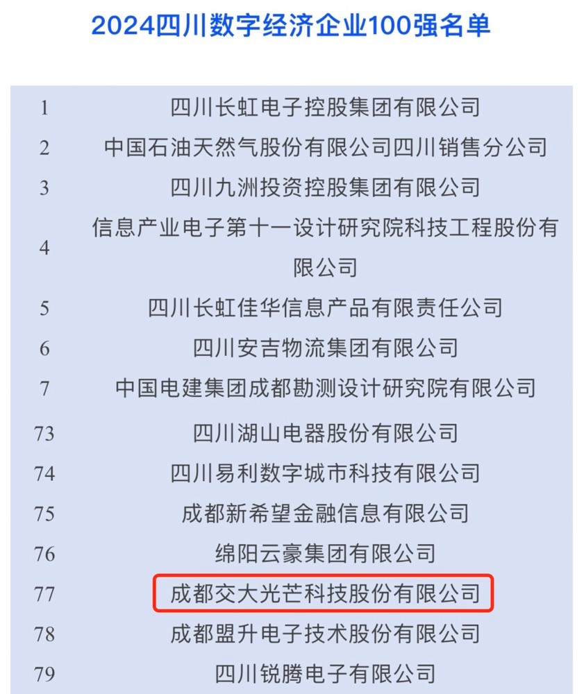 9月26日,由四川省企業(yè)聯(lián)合會(huì)、四川省企業(yè)家協(xié)會(huì)主辦的2024四川大企業(yè)大集團(tuán)發(fā)展大會(huì)在成都召開。會(huì)上,發(fā)布了2024年四川省綜合、制造業(yè)、服務(wù)業(yè)百強(qiáng)、數(shù)字經(jīng)濟(jì)100強(qiáng)企業(yè)榜單。交大光芒榮登四川數(shù)字經(jīng)濟(jì)企業(yè)100強(qiáng)榜單,位列第77位。
