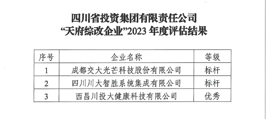 近日,省國(guó)資委對(duì)全省100戶(hù)“天府綜改企業(yè)”2023年度重點(diǎn)改革任務(wù)開(kāi)展情況進(jìn)行了專(zhuān)項(xiàng)評(píng)估,川投集團(tuán)所屬交大光芒、川投數(shù)科獲評(píng)“標(biāo)桿”,川投西昌大健康獲評(píng)“優(yōu)秀”,受到省國(guó)資委通報(bào)表?yè)P(yáng)。