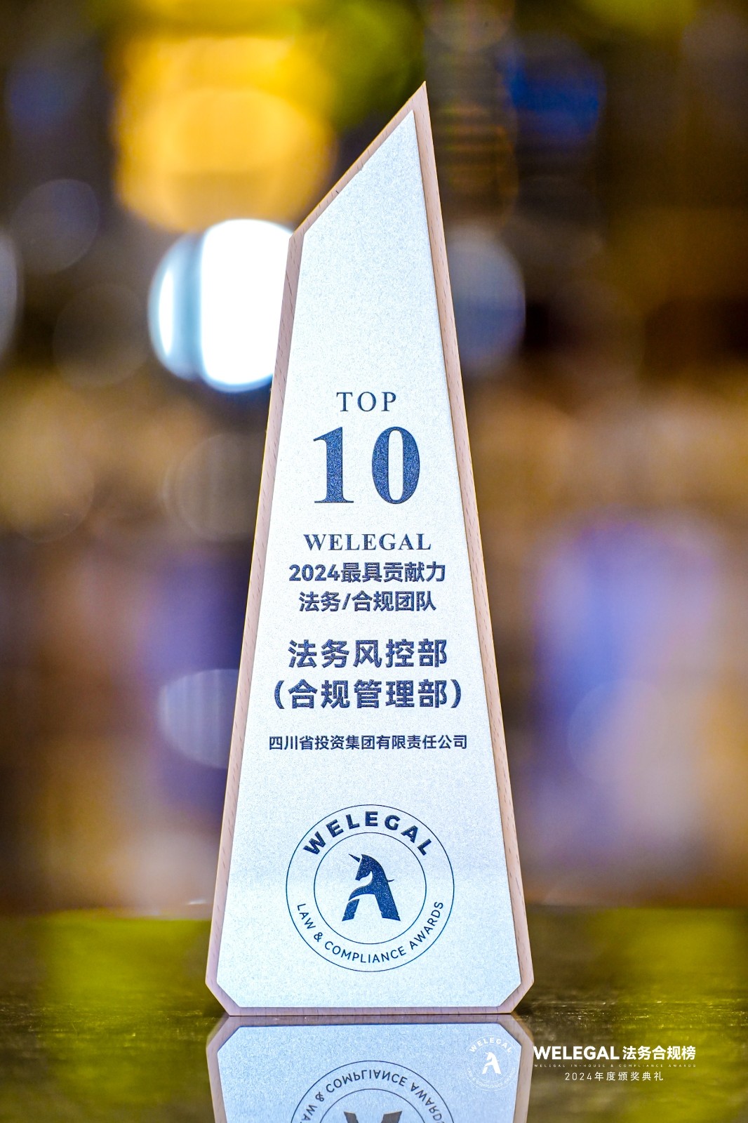 “2024年度WELEGAL法務合規(guī)榜”有中國石油、通威、新浪、微軟(中國)等數百家國央企、頭部民企及外企法務合規(guī)團隊參加評選,經過專家評審及網絡投票,川投集團法務風控部獲得“2024年最具貢獻力法務/合規(guī)團隊TOP10”獎項。