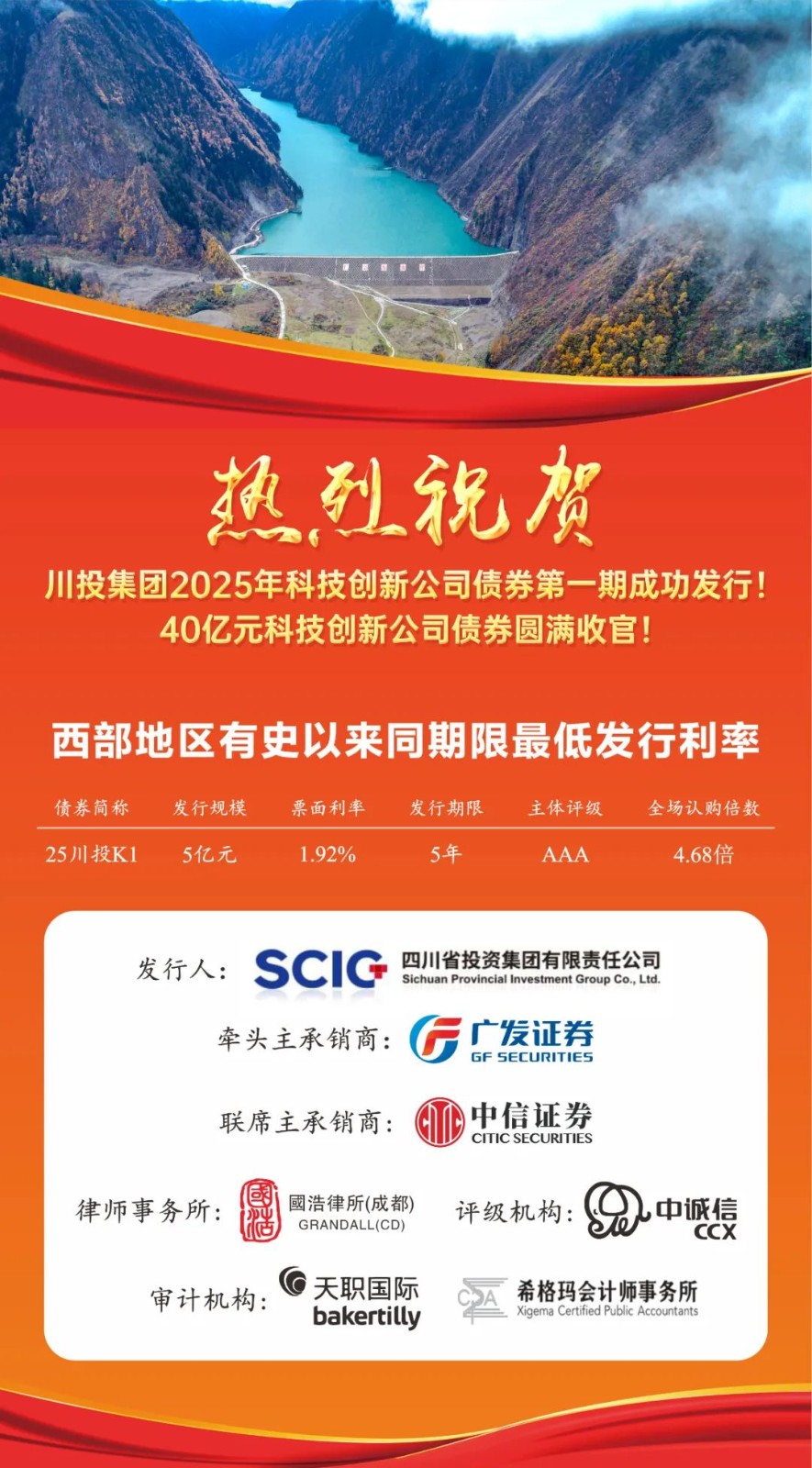 本次發(fā)行全場(chǎng)認(rèn)購(gòu)倍數(shù)4.68倍,吸引了省內(nèi)外近40家銀行與非銀機(jī)構(gòu)廣泛參與,非銀機(jī)構(gòu)認(rèn)購(gòu)占比達(dá)1月9日,川投集團(tuán)在深圳證券交易所成功發(fā)行2025年面向?qū)I(yè)投資者公開(kāi)發(fā)行科技創(chuàng)新公司債券(第一期),發(fā)行規(guī)模5億元,期限5年,發(fā)行票面利率1.92%,為西部地區(qū)有史以來(lái)同期限最低利率。