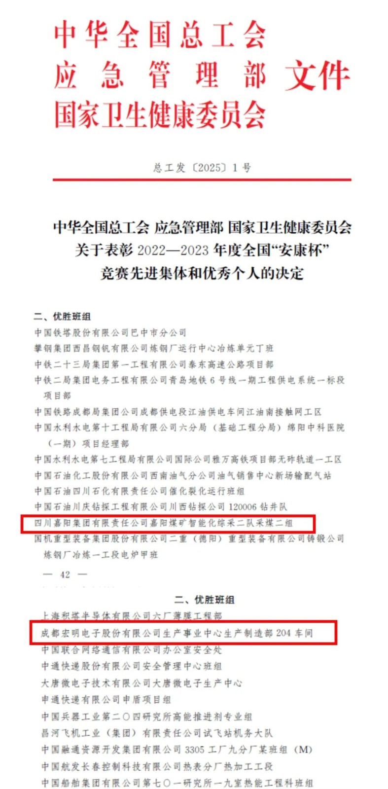 近日,中華全國總工會(huì)、應(yīng)急管理部、國家衛(wèi)生健康委員會(huì)聯(lián)合發(fā)布了《關(guān)于表彰2022-2023年度全國“安康杯”競賽先進(jìn)集體和優(yōu)秀個(gè)人的決定》,川投集團(tuán)所屬嘉陽集團(tuán)嘉陽煤礦智能化綜采二隊(duì)采煤二組和川投信產(chǎn)宏明電子生產(chǎn)事業(yè)中心生產(chǎn)制造部204車間榜上有名,分別獲評全國“安康杯”競賽優(yōu)勝班組。
