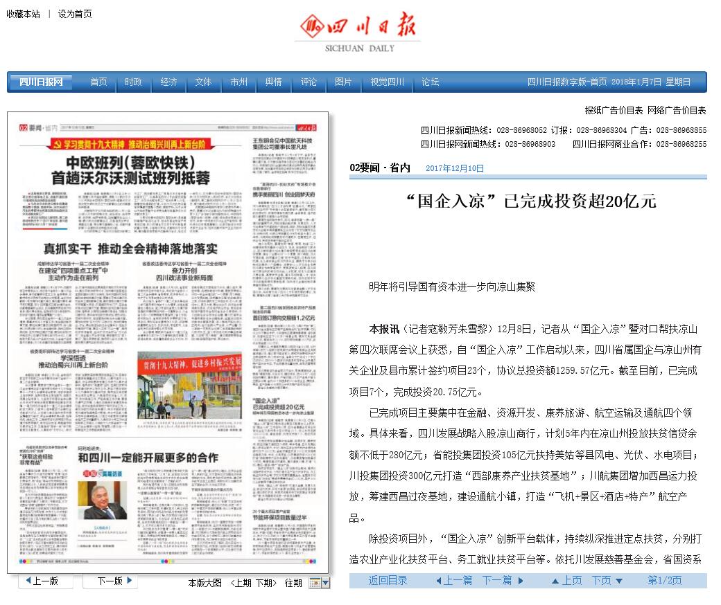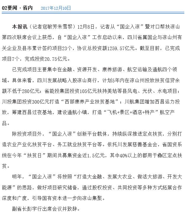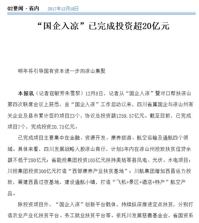 本報訊(記者寇敏芳朱雪黎)12月8日,記者從“國企入涼”暨對口幫扶涼山第四次聯(lián)席會議上獲悉,自“國企入涼”工作啟動以來,四川省屬國企與涼山州有關(guān)企業(yè)及縣市累計簽約項目23個,協(xié)議總投資額1259.57億元。截至目前,已完成項目7個,完成投資20.75億元。