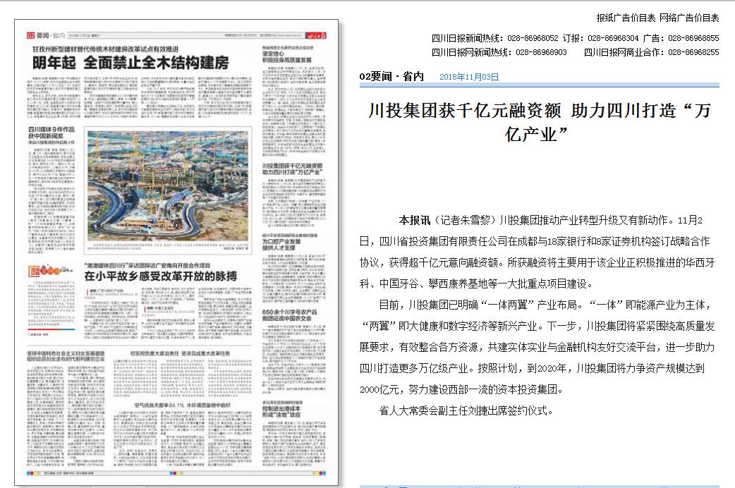 本報訊(記者朱雪黎)川投集團(tuán)推動產(chǎn)業(yè)轉(zhuǎn)型升級又有新動作。11月2日,四川省投資集團(tuán)有限責(zé)任公司在成都與18家銀行和8家證券機(jī)構(gòu)簽訂戰(zhàn)略合作協(xié)議,獲得超千億元意向融資額。所獲融資將主要用于該企業(yè)正積極推進(jìn)的華西牙科、中國牙谷、攀西康養(yǎng)基地等一大批重點(diǎn)項目建設(shè)。