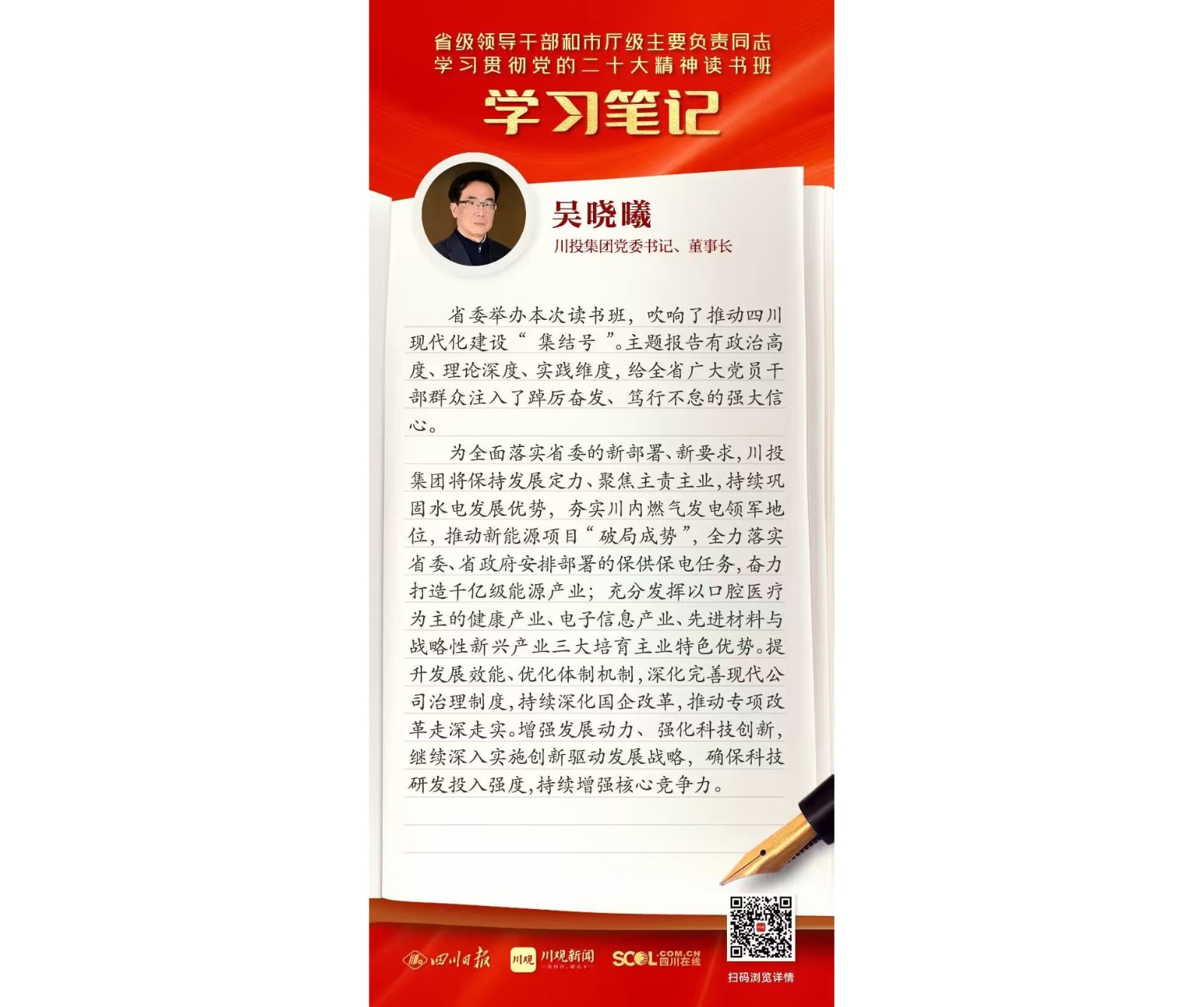 為全面落實(shí)省委的新部署、新要求,川投集團(tuán)將保持發(fā)展定力、聚焦主責(zé)主業(yè),持續(xù)鞏固水電發(fā)展優(yōu)勢,夯實(shí)川內(nèi)燃?xì)獍l(fā)電領(lǐng)軍地位,推動新能源項目“破局成勢”,全力落實(shí)省委、省政府安排部署的保供保電任務(wù),奮力打造千億級能源產(chǎn)業(yè);充分發(fā)揮以口腔醫(yī)療為主的健康產(chǎn)業(yè)、電子信息產(chǎn)業(yè)、先進(jìn)材料與戰(zhàn)略性新興產(chǎn)業(yè)三大培育主業(yè)特色優(yōu)勢。提升發(fā)展效能、優(yōu)化體制機(jī)制,深化完善現(xiàn)代公司治理制度,持續(xù)深化國企改革,推動專項改革走深走實(shí)。增強(qiáng)發(fā)展動力、強(qiáng)化科技創(chuàng)新,繼續(xù)深入實(shí)施創(chuàng)新驅(qū)動發(fā)展戰(zhàn)略,確??萍佳邪l(fā)投入強(qiáng)度,持續(xù)增強(qiáng)核心競爭力。