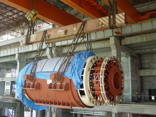 通過各參建單位的共同努力,用時(shí)近一個(gè)小時(shí)的#1發(fā)電機(jī)定子吊裝工作順利完成,初步檢驗(yàn)了#1汽輪發(fā)電機(jī)土建結(jié)構(gòu)和行車負(fù)載滿足要求,為下一步汽輪機(jī)安裝打下了基礎(chǔ)。
