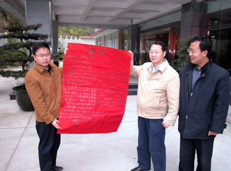 理張邦全(左二)從中鐵十六局田灣河項目部經(jīng)理李樹浩(右一)手中接過喜報